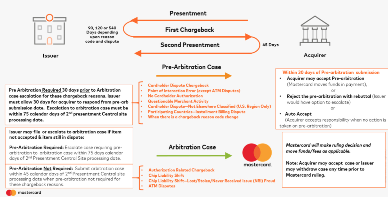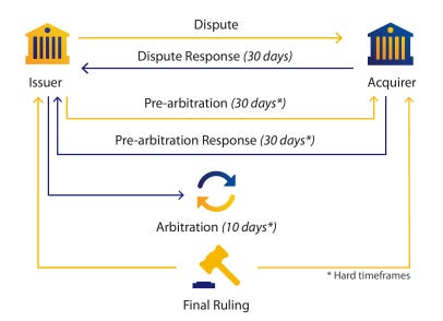 Arbitration (10 days*): If the acquirer fights the pre-arbitration and the issuer does not agree with the acquirer's response, the issuer has 10 days to escalate the case to arbitration.