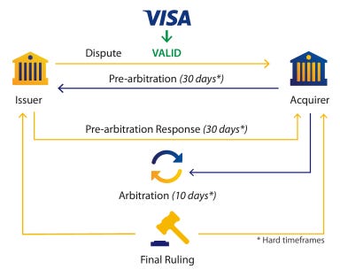Arbitration (10 days*): If the acquirer receives a pre-arbitration response but continues to disagree with the issuer's response, the acquirer has 10 days to escalate the case to arbitration to Visa.